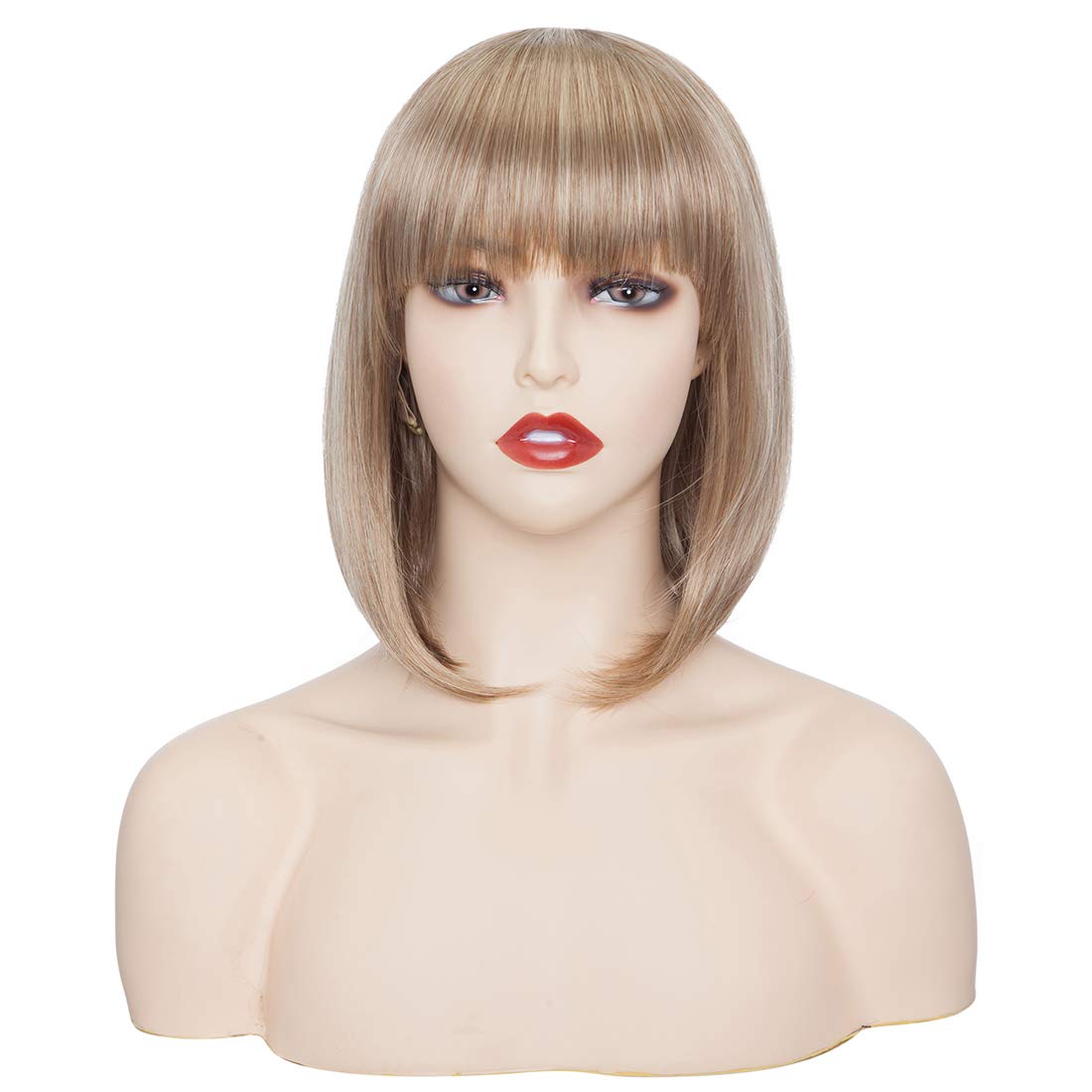 Short Blonde Bob Wig with Bangs for Women Short Straight Bob Wigs Heat Resistant Synthetic Hair Wig for Cosplay Costume Daily Halloween Party (12inch, Dark Blonde Mix Bleach Blonde)